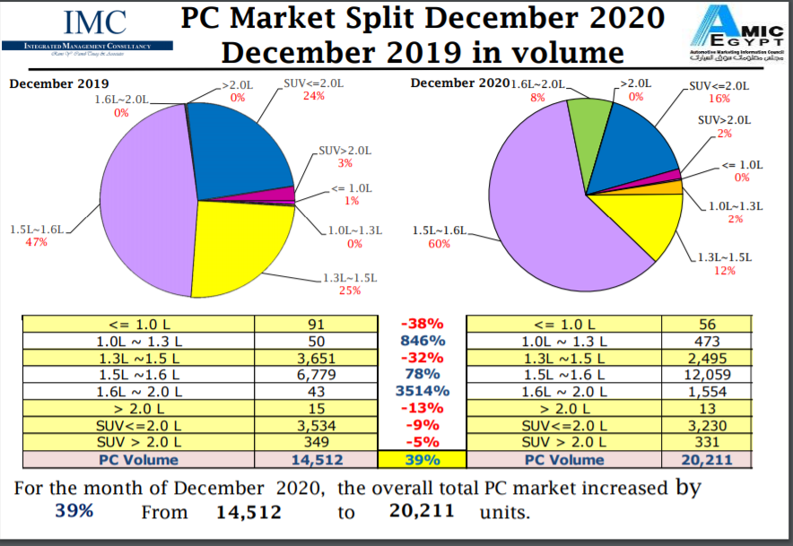 وأوضح التقرير الصادر، أرتفاع معدل مبيعات السيارات ذات السعة اللترية ما بين ( 1000 CC : 1300 CC) خلال ديسمبر 2020 إلى 473 سيارة، مقارنة بمبيعات ديسمبر 2019 والتي وصلت إلى 50 سيارة ؛ فيما سجلت مبيعات السيارات ذات السعة اللترية ما بين (1300 CC : 1500 CC) انخفاضًا بنسبة 32% حيث وصلت المبيعات خلال ديسمبر 2020 إلى 2495 سيارة، مقارنة بمبيعات ديسمبر 2019 والتي سجلت 3651 سيارة.