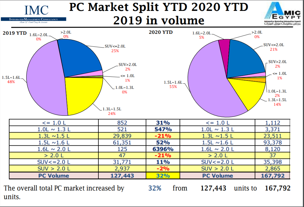 ووضح التقرير انخفاض في معدل مبيعات (الملاكي) ذات السعة اللترية 1300 CC وحتي 1500 CC بنسبة 21% بمبيعات وصلت إلى 23511 سيارة خلال 2020، مقارنة بمبيعاتها خلال 2019 حيث سجلت مبيعات 29839 سيارة؛ فيما ارتفع معدل مبيعات السيارات الملاكي ذات السعة اللترية 1500 CC و 1600CC خلال 2020 بمبيعات 93378 سيارة، مقارنة بمبيعاتها خلال 2019 التي وقفت عن حد بيع 61351 سيارة.