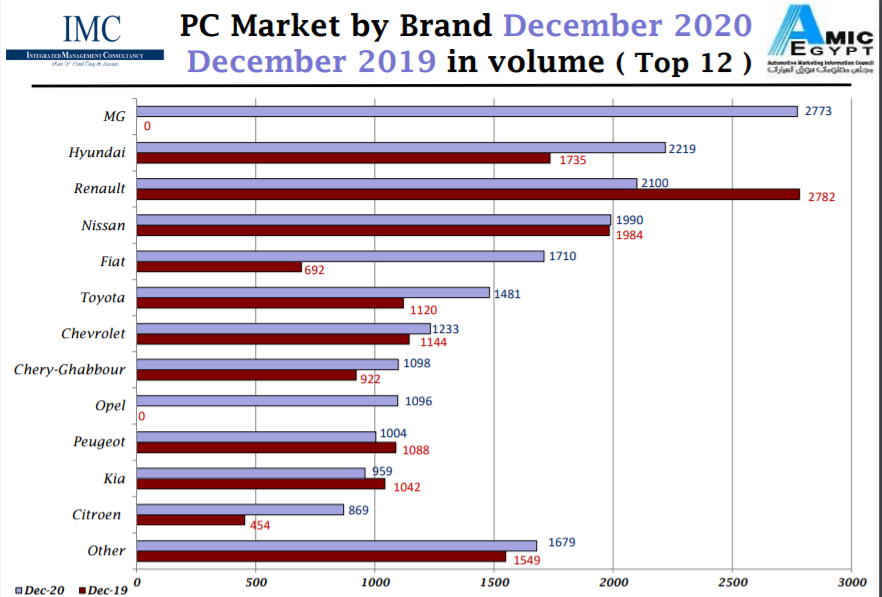 واحتلت العلامة التجارية لشركة السيارات "أم جي" التي انتشرت بالسوق المحلي المصري منذ الربع الأخير للعام 2018 ، المركز الأول بالقائمة بمبيعات 2773 سيارة خلال ديسمبر 2020؛ كما ارتفع معدل مبيعات سيارات "هيونداي" بعدد 2219 سيارة، مقارنة بمبيعات ديسمبر 2019، والتي سجلت مبيعات ب عدد 1735 سيارة.