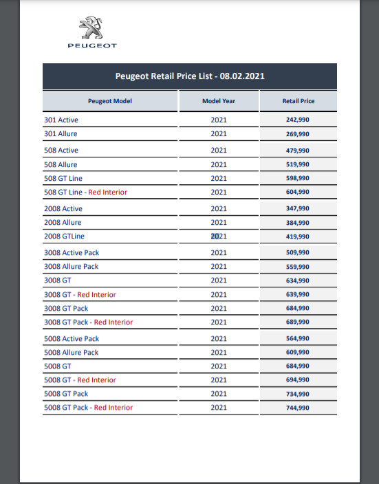 وحسب المعلن عنه، جاء طراز "بيجو 301" بفئتين الأولى بسعر 243 ألف جنيه، والثانية بسعر 270 ألف جنيه ،كما جاء سعر طراز "بيجو 508" بـ 4 فئات مختلفة التجهيزات الأولى منها بسعر 480 ألف جنيه، والثانية بـ 520 ألف جني، والثالثة بـ 599 ألف جنيه، والرابعة بسعر 605 ألف جنيه.