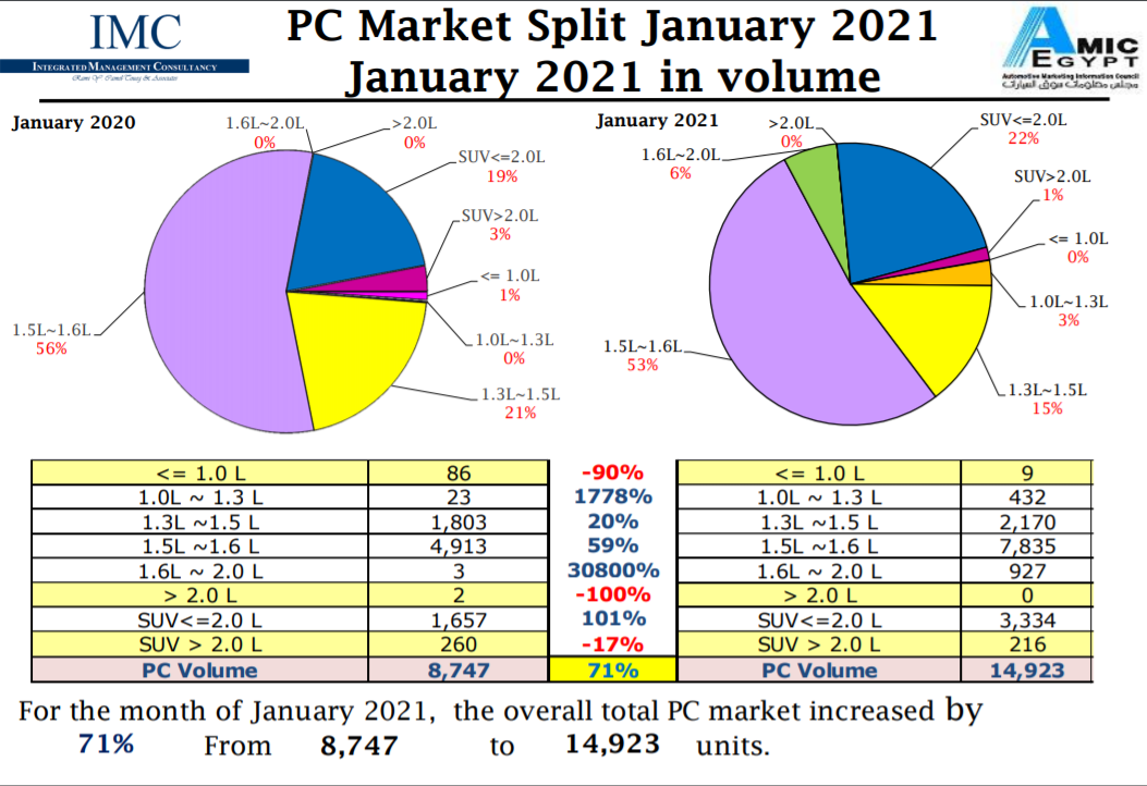 فيما سجلت السيارات الملاكي فئة السيارات الرياضية متعددة الاستخدامات SUV ذات السعة اللترية 2.0 لتر أو أقل، ارتفاعًا خلال يناير 2021 داخل السوق المحلي بنسبة 101% وسجلت عدد 3334 سيارة، مقارنة بمعدل مبيعاتها خلال يناير 2020 حيث سجلت عدد 1657 سيارة .