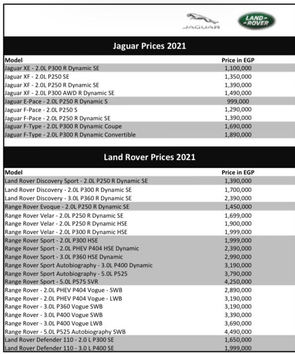 أعلنت شركة MTI وكلاء العلامات الفاخرة چاجوار ولاندروڤر عن أحدث أسعار سياراتها وجاءت الأسعار كالآتى: