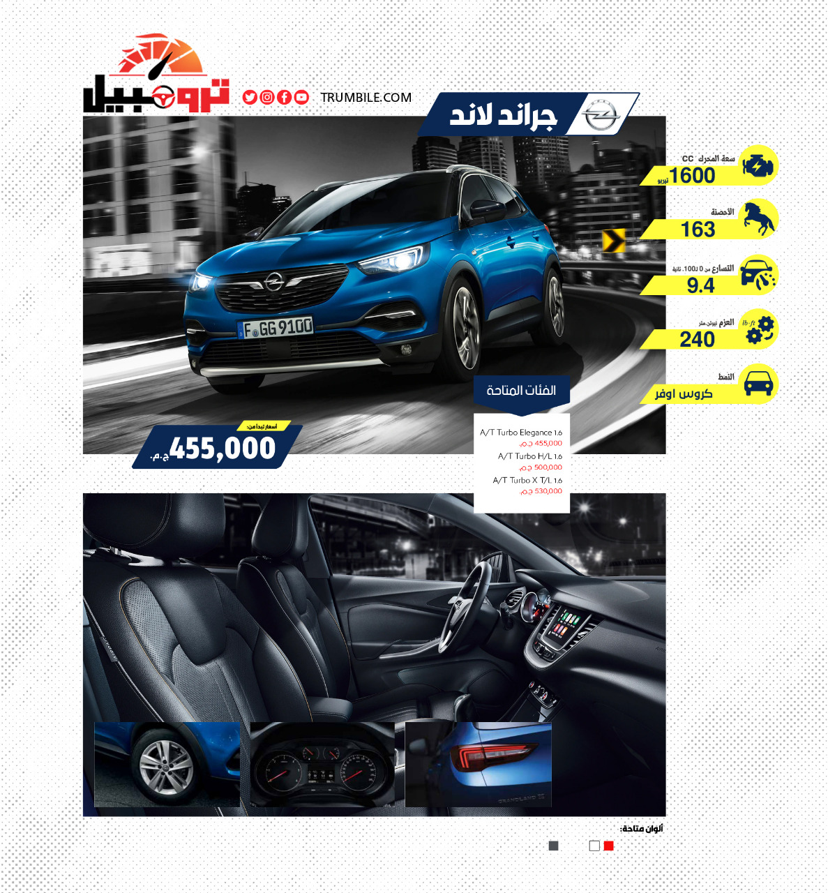 سوق السيارات الأحد، 7 مارس 2021 03:18 مـ بتوقيت القاهرة 2021-03-07 15:18:29 انفوجراف ..أسعار ومواصفات ”أوبل جراند لاند” في مصر انفوجراف: محمود حسانين ينشر «ترومبيل» أسعار ومواصفات السيارة أوبل جراند لاند، خلال الأنفوجراف التالي، وفقا لآخر تحديث للوكلاء في مارس 2021. ⇧