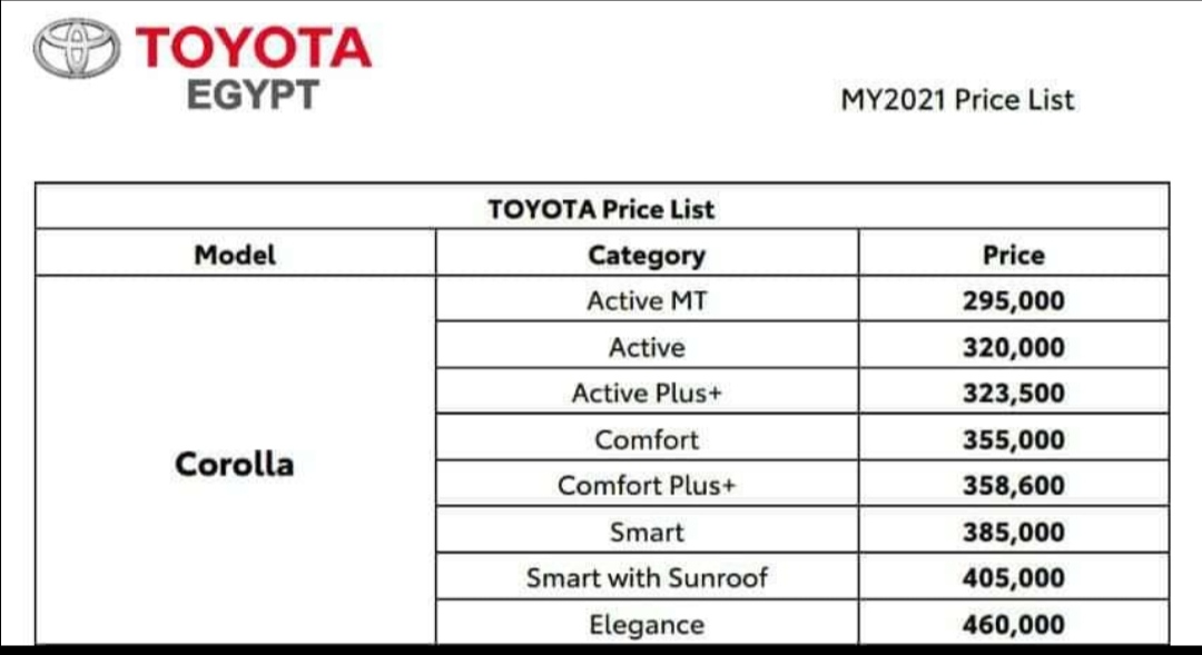 الفئة الرابعة من تويوتا كورولا تنطلق بالسوق المحلي المصري بسعر 355,000 جنيه و الفئة الخامسة بـ358,600 جنيه والفئة السادسة بسعر 385,000 جنيه، فيما تباع الفئة السابعة بـ405,000 جنيه، والفئة الأعلى تجهيزًا 460,000 جنيه.