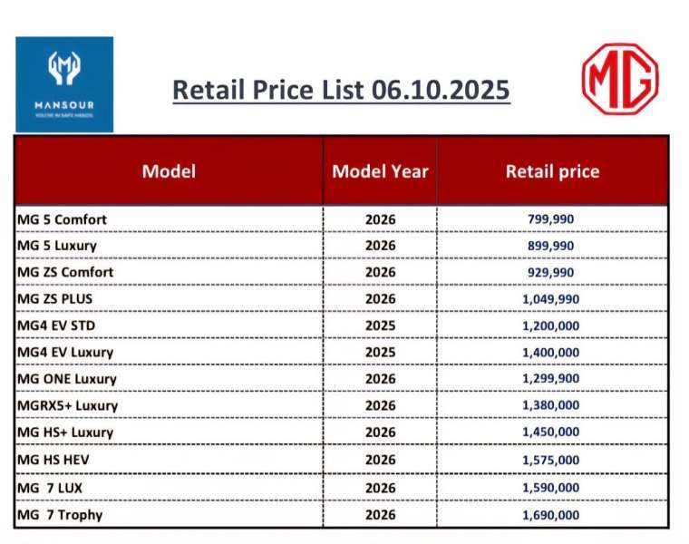 ووفًقا للقائمة السعرية الجديدة الصادرة عن "المنصور MG"، تم تخفيض أسعار طرازى "MG "ZS، و"MG "5، وبلغت قيمة التخفيض على أسعار الطراز "ZS" نحو 60 ألف جنيه فى فئة "comfort" و30 ألف جنيه فى فئة "plus"، بينما انخفضت أسعار الطراز "MG "5، فئة "luxury" بقيمة بلغت 50 ألف جنيه، كما شهدت القائمة السعرية الجديدة طرح الفئة الجديدة "comfort" من MG "5".