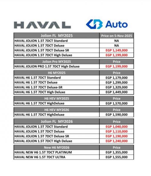 أعلنت شركة "جى بى أوتو" غبور، وكيل علامة "هافال" فى مصر، عن أحدث قائمة سعرية لسيارات العلامة "هافال" فى السوق المصرية، التى جاءت كالتالى: