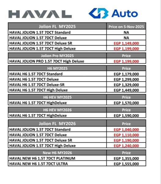 أعلنت شركة "جى بى أوتو" غبور، وكيل علامة "هافال" فى مصر، عن أحدث قائمة سعرية لسيارات "هافال" فى السوق المحلية، التى شهدت تخفيضات على هافال "جوليان" Facelift 2025 و"جوليان برو" 2025، وطرح "جوليان" موديل 2026، وجاءت الأسعار كالتالى: