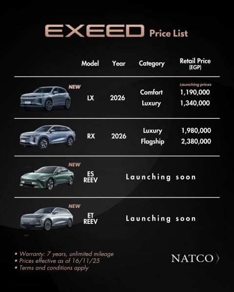 أعلنت مجموعة "ناتكو" وكيل علامة "EXEED" الصينية الفاخرة فى مصر، عن أحدث قائمة سعرية لسيارات "EXEED" فى السوق المحلية، وذلك عقب إطلاق السيارة "LX" الجديدة لأول مرة فى مصر بأسعار تنافسية.