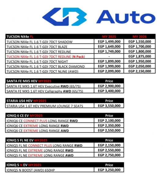 أعلنت شركة "جى بى أوتو" غبور ، وكيل علامة "هيونداى" فى مصر، عن أحدث قائمة سعرية لسيارات "هيونداى" فى السوق المحلية، التى جاءت كالتالى: