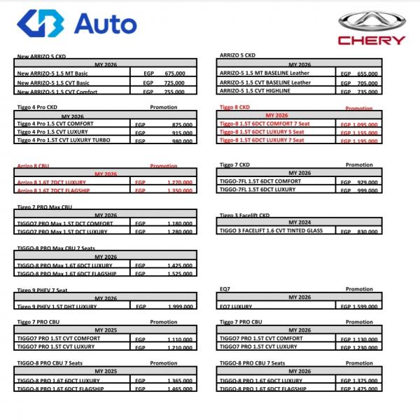 أعلنت شركة "جى بى أوتو" غبور ، وكيل علامة "شيرى" فى مصر، عن أحدث قائمة سعرية لسيارات "شيرى" فى السوق المحلية، عقب تخفيض أسعار طراز "Arrizo 8" بقيمة تصل إلى 100 ألف جنيه، وأيضًا تخفيض أسعار "Tiggo 8 CKD" بقيمة تصل إلى 55 ألف جنيه.
