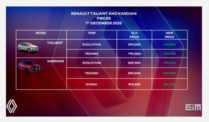 أعلنت الشركة المصرية العالمية للسيارات "EIM"، وكيل علامة "رينو" الفرنسية العريقة فى مصر، عن تخفيض أسعار رينو "تاليانت" و" كارديان" فى السوق المحلية، لتزداد المنافسة احتدامًا فى سوق السيارات، وعلى المستهلك اتخاذ قرار الشراء وفقًا لاحتياجاته ورغباته، ولما يتناسب مع قدرته الشرائية.