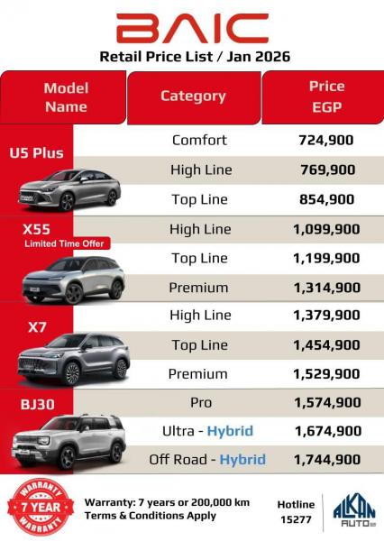 أعلنت شركة "ألكان أوتو"، الوكيل الحصرى لعلامة "BAIC" فى مصر، عن تخفيضات استثنائية على أسعار السيارة بايك "X55" فى السوق المحلية تصل إلى 100,000 جنيه لفترة محدودة من 15 يناير الجارى حتى 15 فبراير القادم، ليبدأ سعرها من 1,099,900 جنيه.
