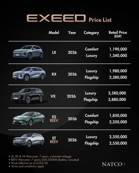 أعلنت "ناتكو"، وكيل علامة "إكسيد"، فى مصر، عن أحدث قائمة سعرية لسياراتها، مع طرح موديلات "إكسيد" لعام 2026 فى السوق المحلية، وتأتى الأسعار كالتالى: