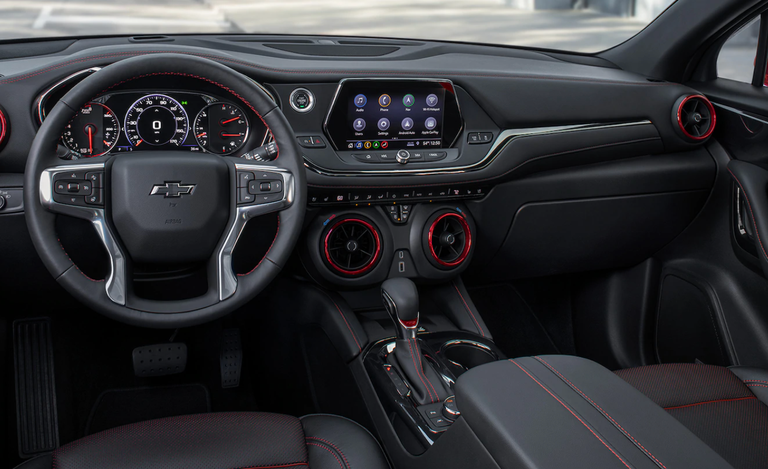 من الداخل، يتمتع طراز شيفروليه "Blazer" لعام 2021 بصالون داخلي يكفي لعدد 5 ركاب، ومساحة أسفل القدم بالمقاعد الأمامية تصل إلى 41 بوصة، ومساحة للأعلى لامتداد الرأس تصل إلى 39.8 بوصة، وبالمقاعد الخلفية تتوفر مساحة للأسفل لامتداد القدم تصل إلى 39.6 بوصة، ومساحة للأعلى تصل إلى 38.6 بوصة.