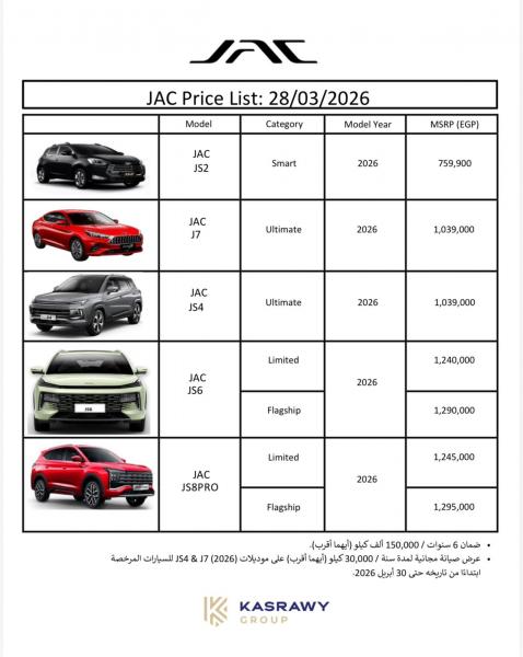 أعلنت "قصراوى جروب"، الوكيل الحصرى لعلامة "جاك JAC" فى مصر، عن أحدث قائمة سعرية لسيارات "جاك" فى السوق المحلية، والتى تأتى كالتالى: