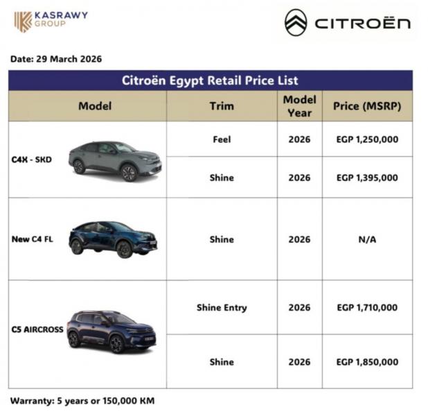 أعلنت "قصراوى جروب"، الوكيل الحصرى لعلامة "ستروين" فى مصر، عن أحدث قائمة سعرية لسيارات "ستروين" فى السوق المحلية، والتى تأتى كالتالى: