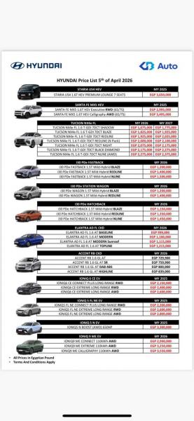 أعلنت "جى بى أوتو" وكيل علامة "هيونداى" فى مصر، عن أحدث قائمة سعرية لسيارات "هيونداى" فى السوق المحلية، التى جاءت كالتالى: