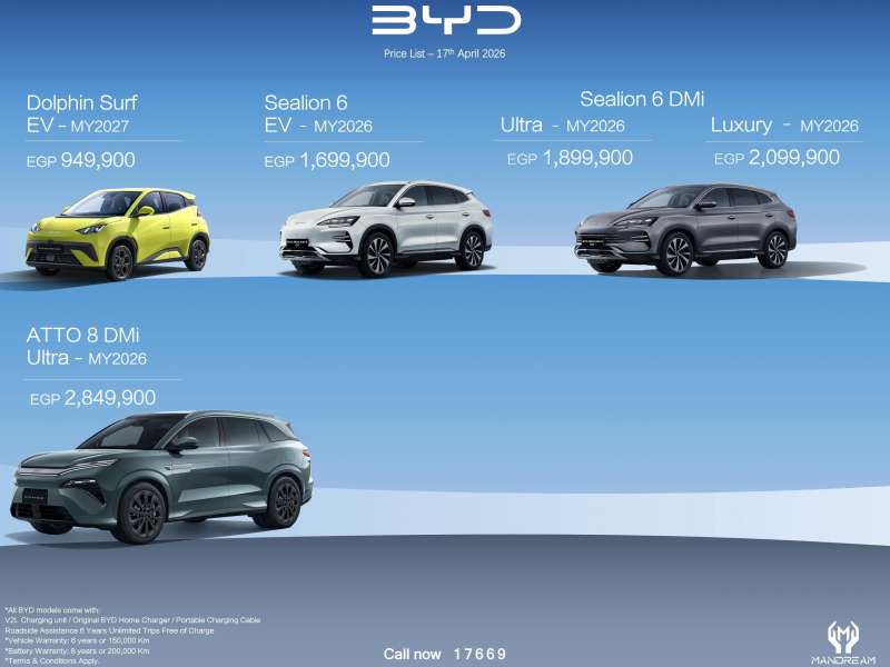 أعلنت "ManDream" الوكيل الرسمى لعلامة "BYD" فى مصر، عن أحدث قائمة سعرية لسيارات "BYD" الكهربائية فى السوق المصرية، عقب انضمام أحدث طرازاتها ATTO 8" DMi" لعائلة "BYD"، الذى تم إطلاقه رسميًا فى مصر بسعر يبلغ 2,849,900.