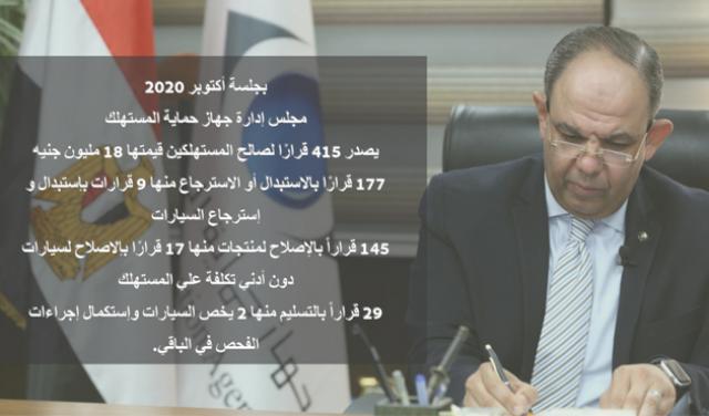 وصرح الدكتور أحمد سمير فرج القائم بأعمال رئيس جهاز حماية المستهلك والمدير التنفيذي عن قيام المجلس بمناقشة واصدار قرارات ملزمةفى عدد 415 شكوى بلغت قيمتها 18 مليون جنيه لصالح المستهلكين، منهم 30 شكوى فى مجال السيارات و 385 شكوى فى مجال السلعالمعمرة والمتنوعة.